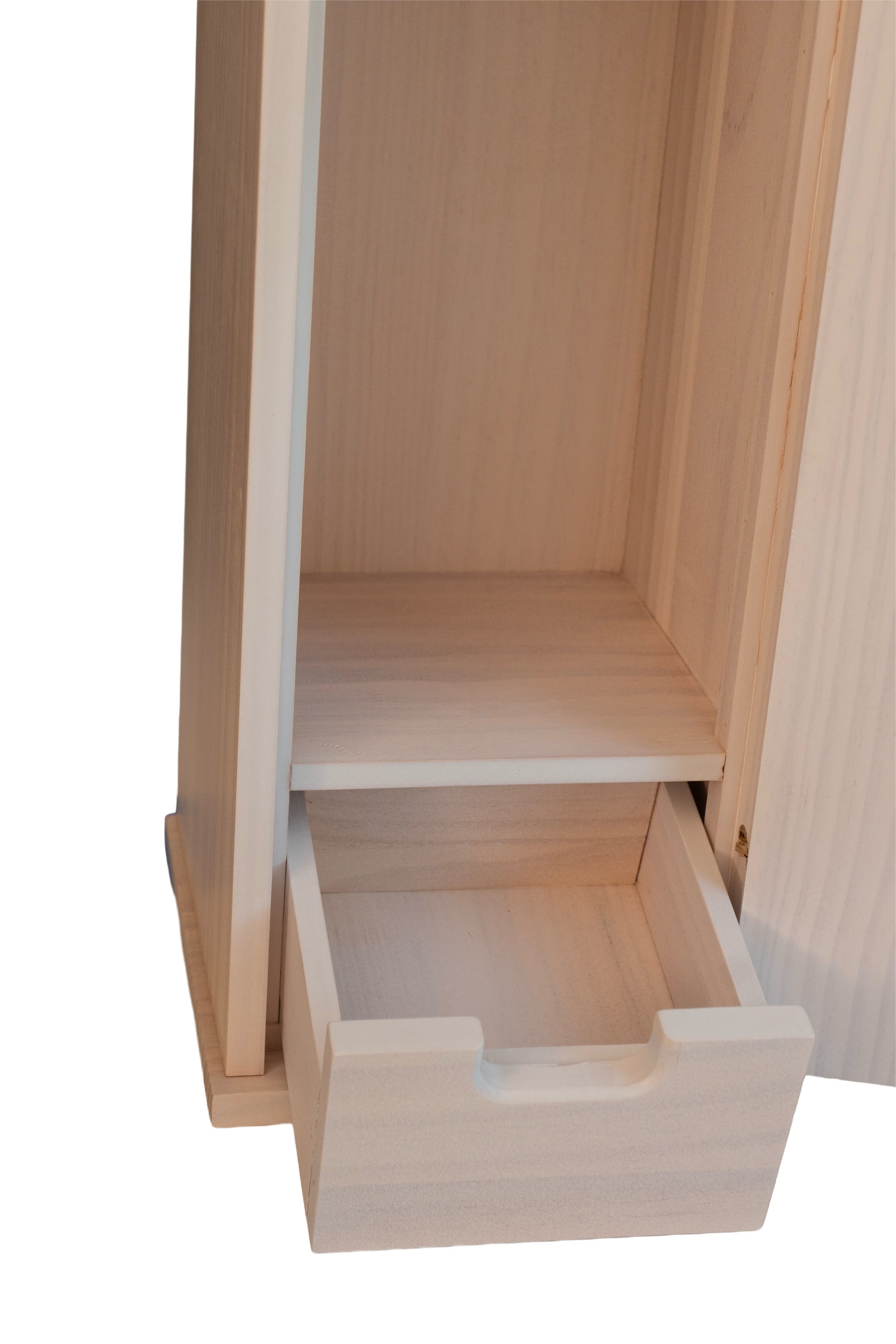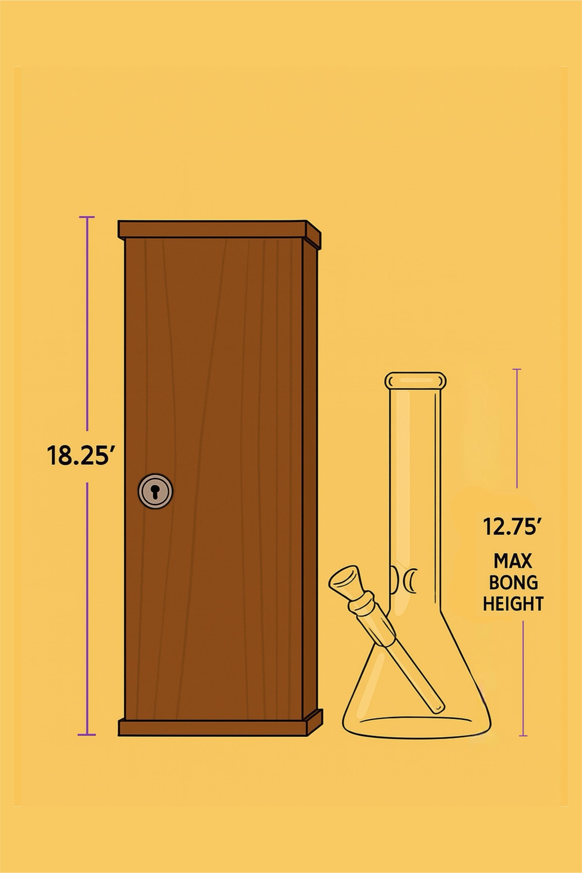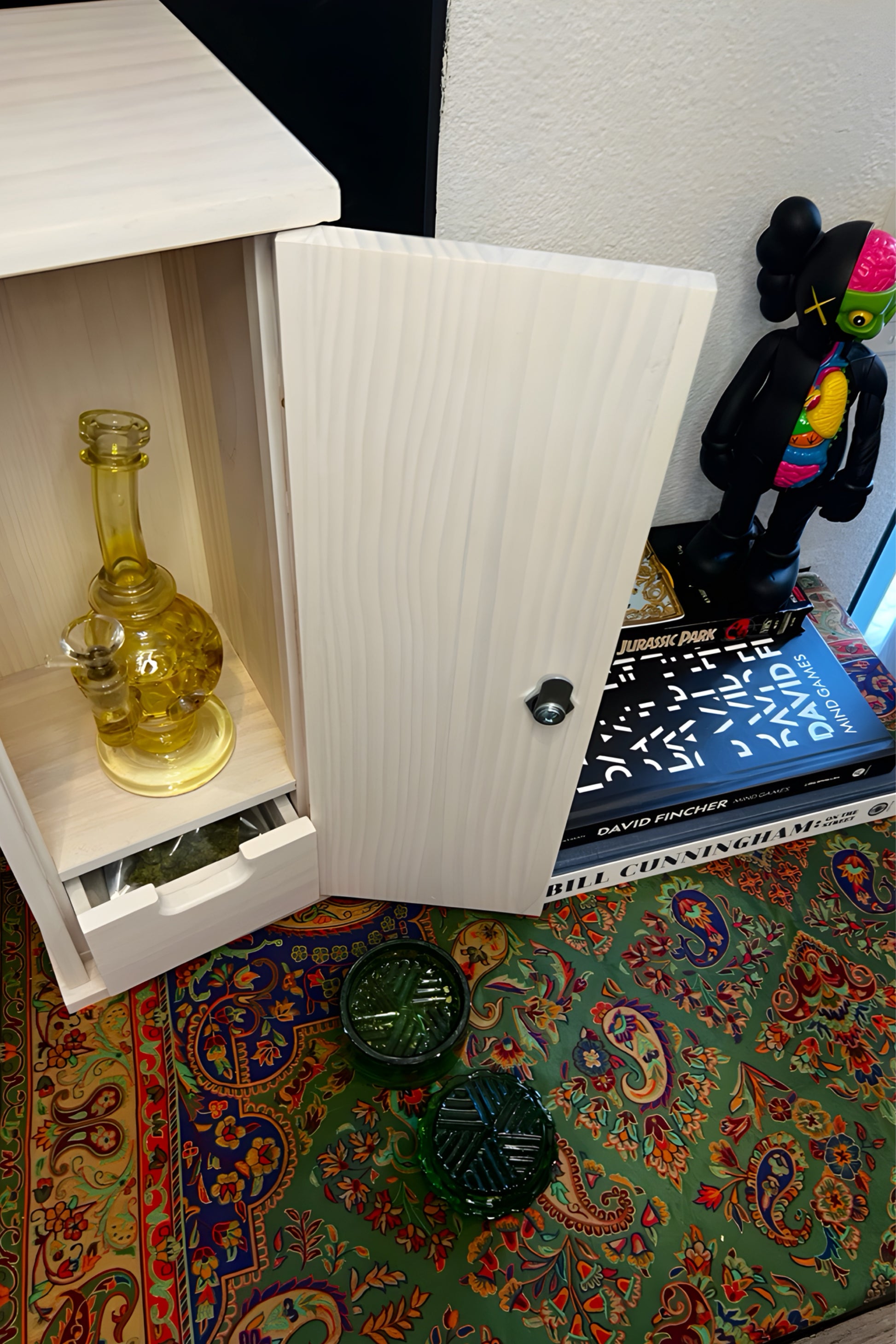 Inside, a spacious compartment fits bongs up to 12.75" tall, no more hiding in closets. A built-in cubby drawer keeps lighters, flower, and accessories neatly organized and always within reach. The locking door comes with two keys for added peace of mind.