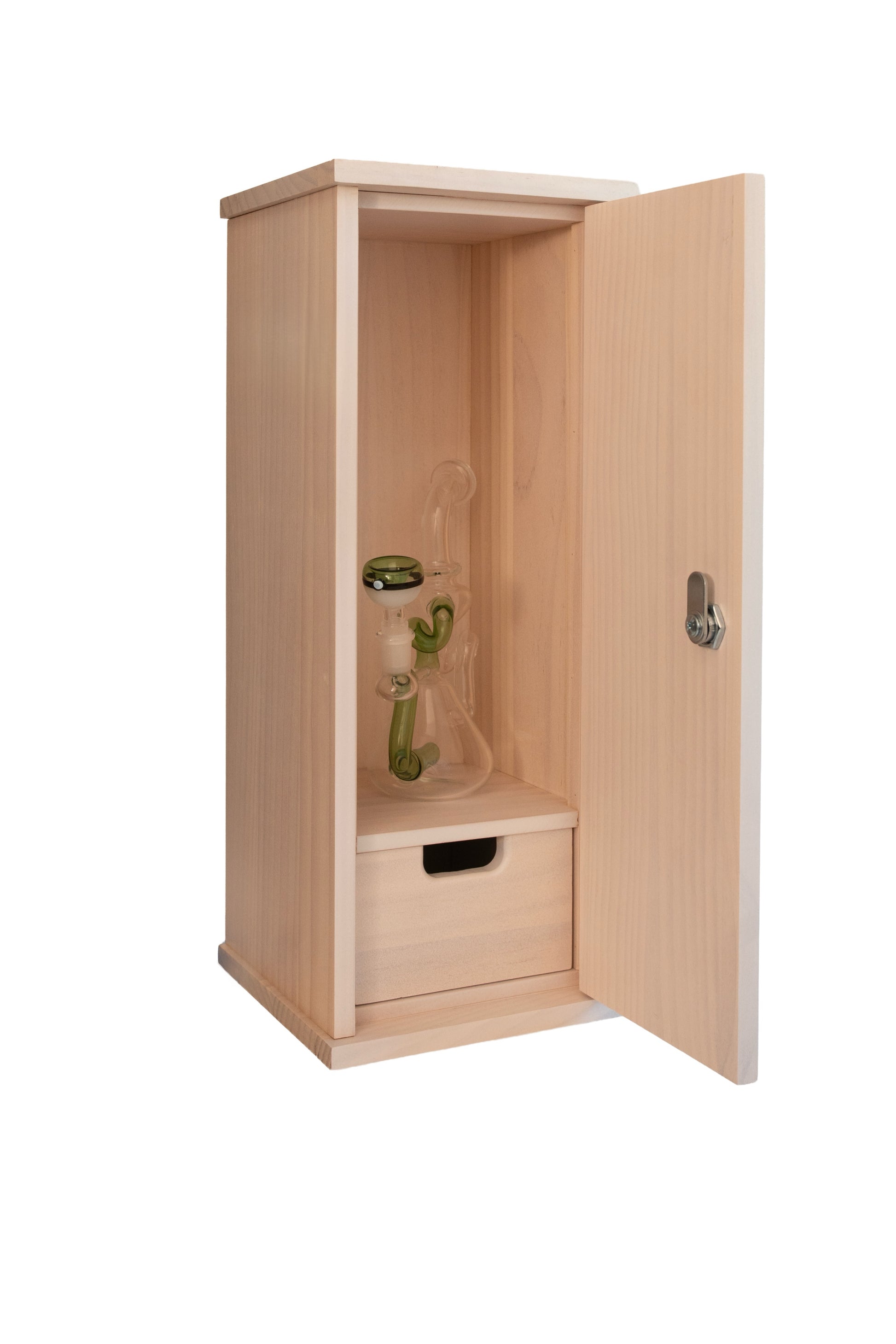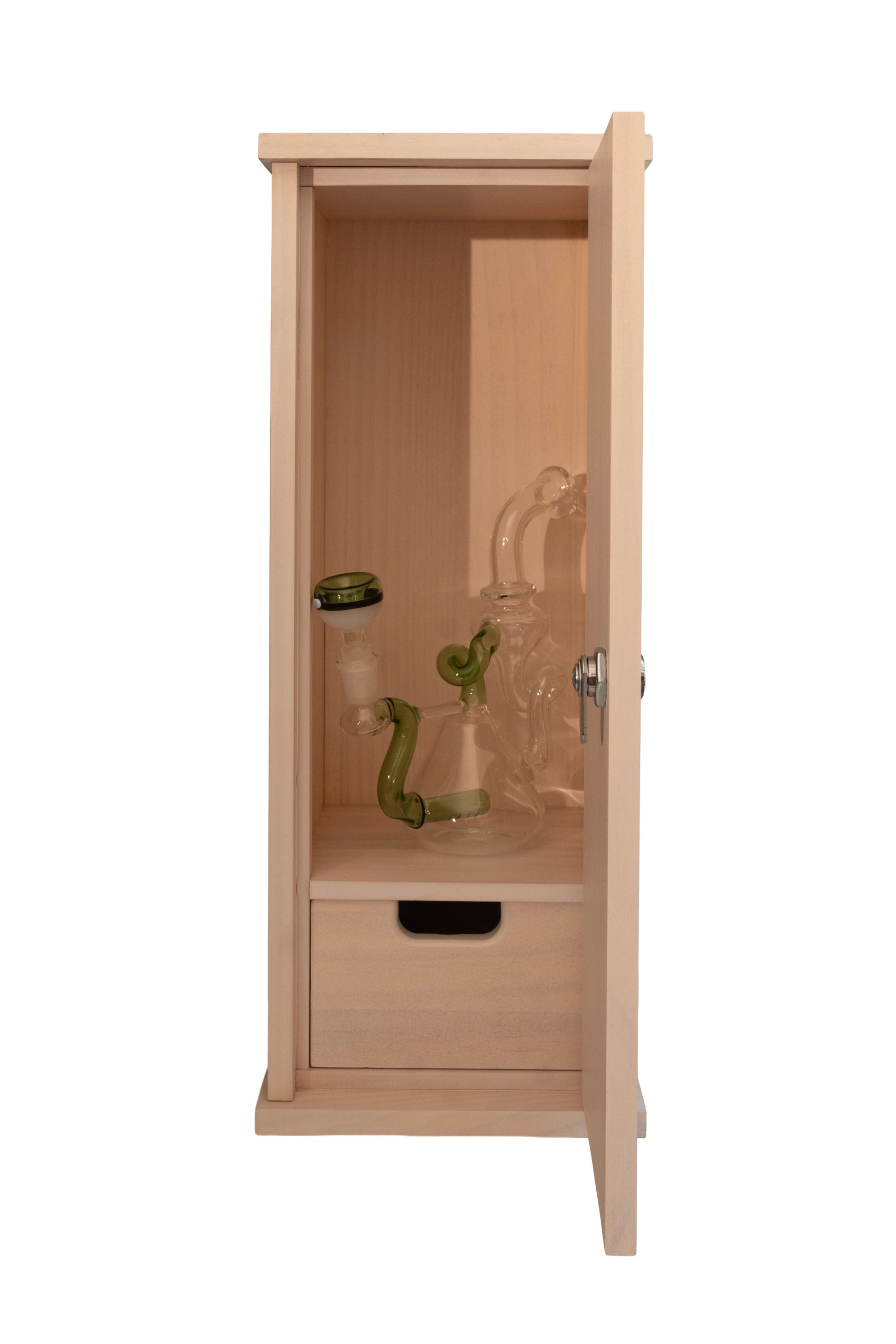 A soft white, airy pine wood finish that feels light and understated. Ideal for clean, modern spaces, Cloud Nine is a discreet lockable cabinet designed specifically for bong storage. It blends effortlessly into your surroundings, keeping your glass safe, hidden, and close at hand.