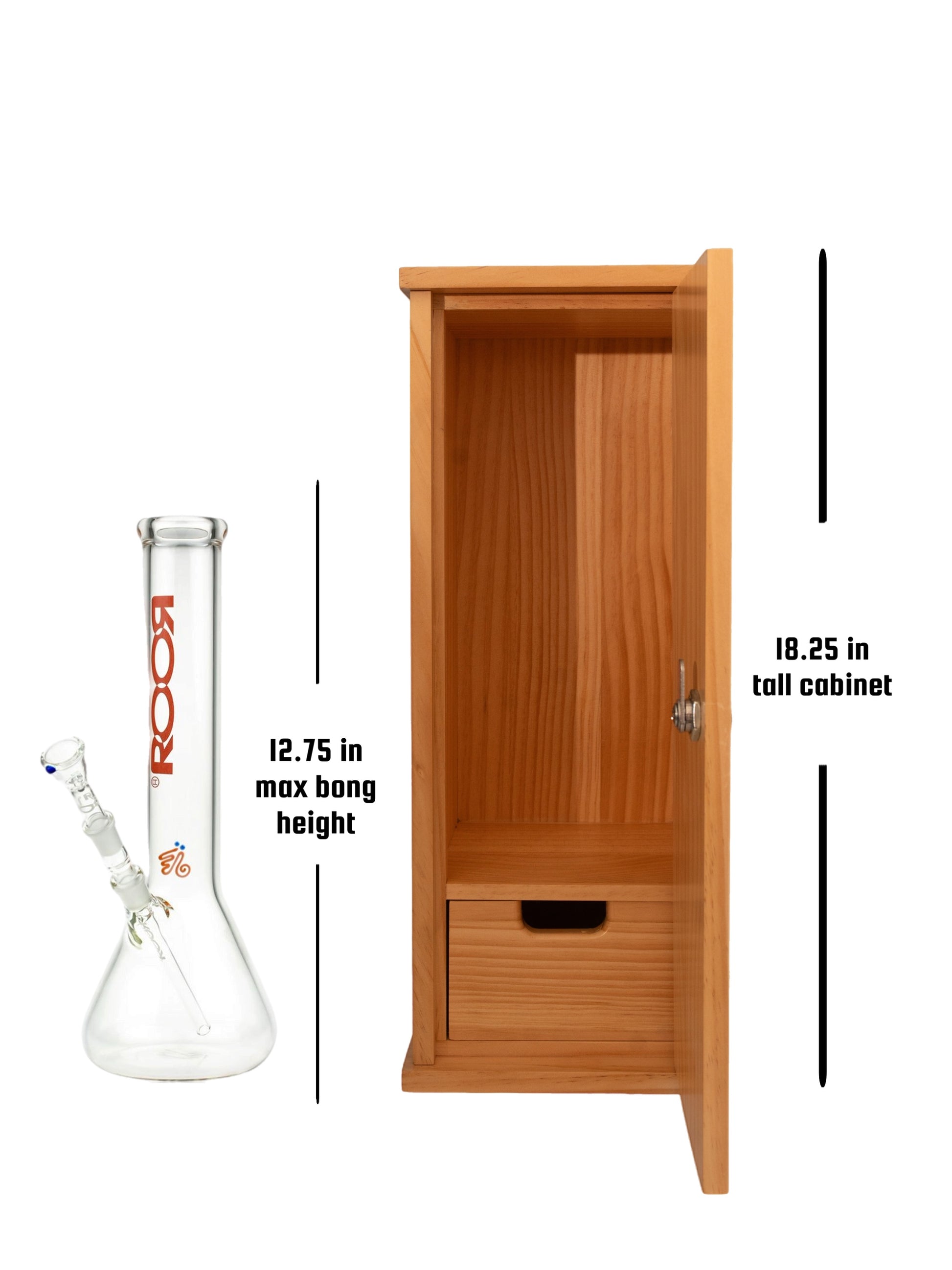 Thoughtfully designed to hold bongs up to 12.75" tall, with a built-in drawer for your accessories — from lighters to flower. A locking door with two included keys ensures your setup stays secure, discreet, and yours alone.