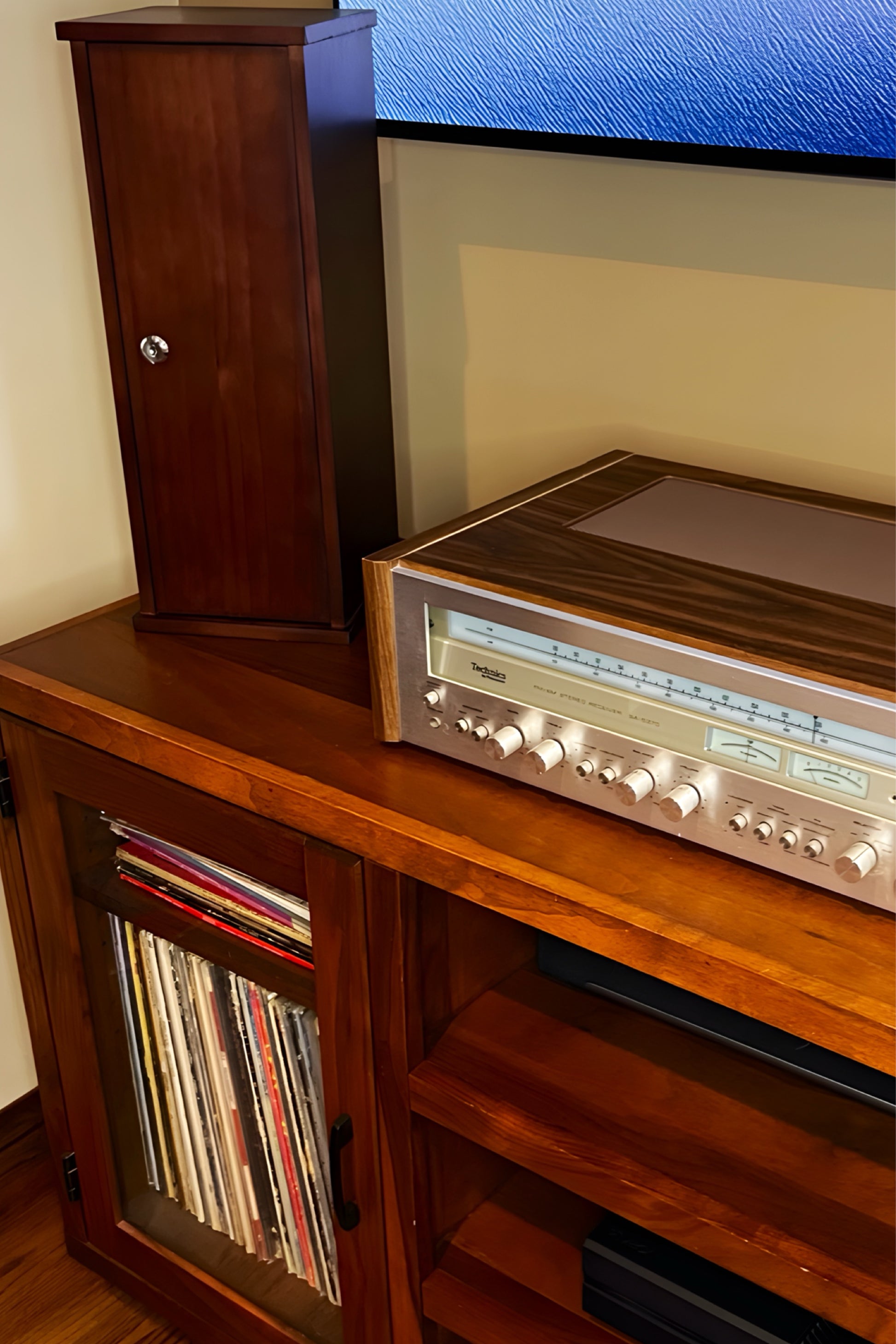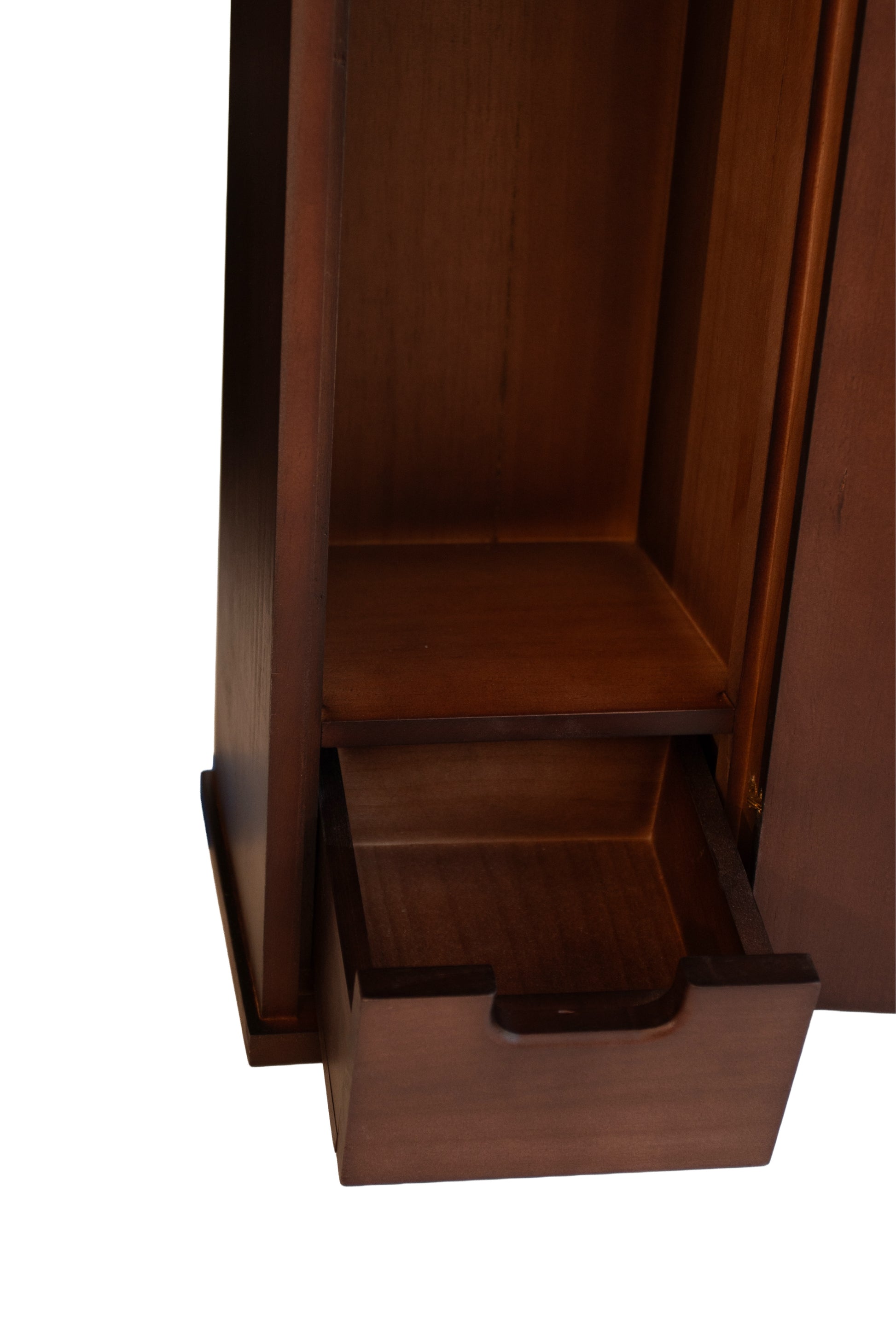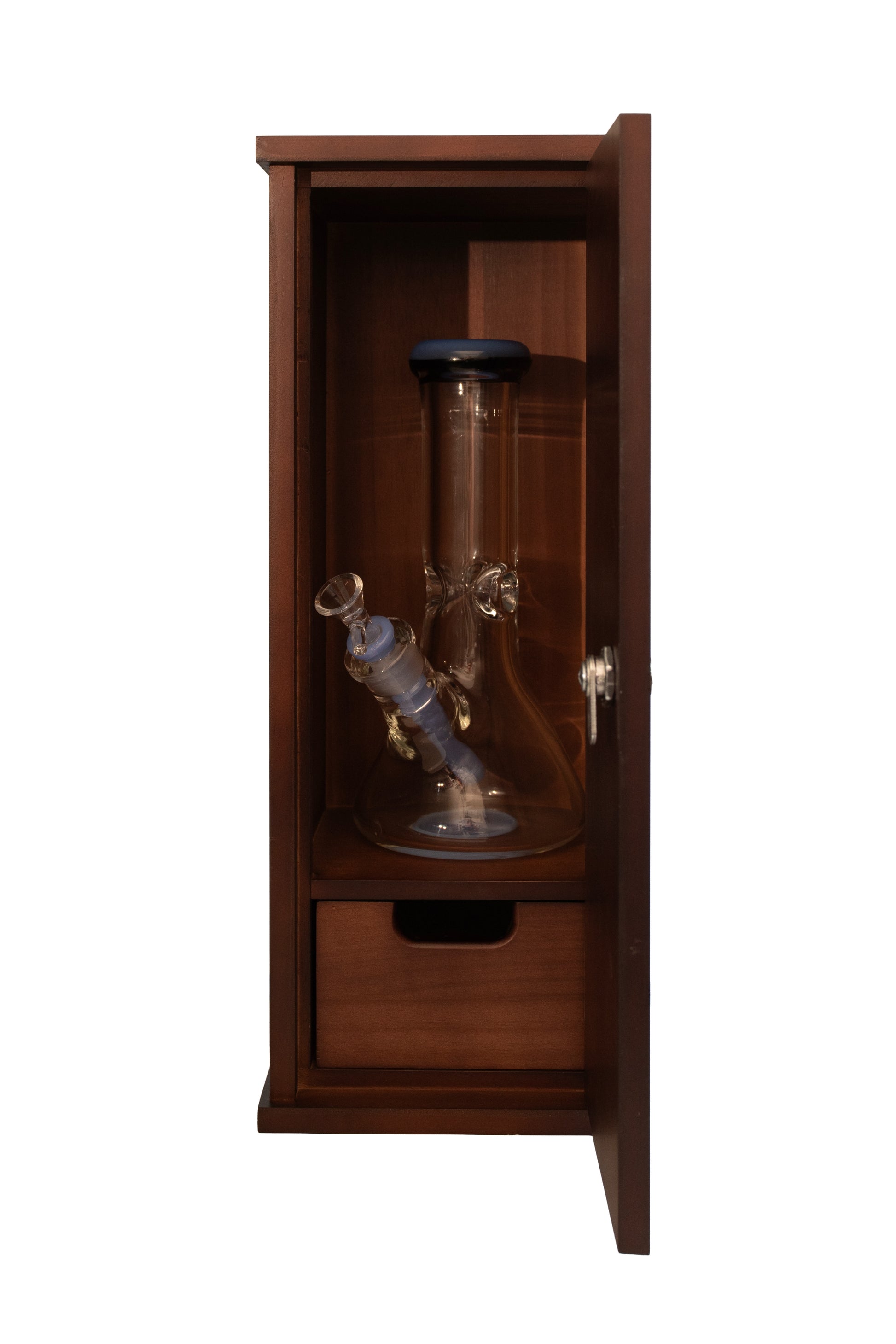 A timeless dark pine finish that feels classic and grounded. Nightcap is a secure, lockable bong cabinet designed to quietly blend into deeper-toned interiors. Rich and understated, it brings discreet elegance to your space while keeping your glass protected and out of view.